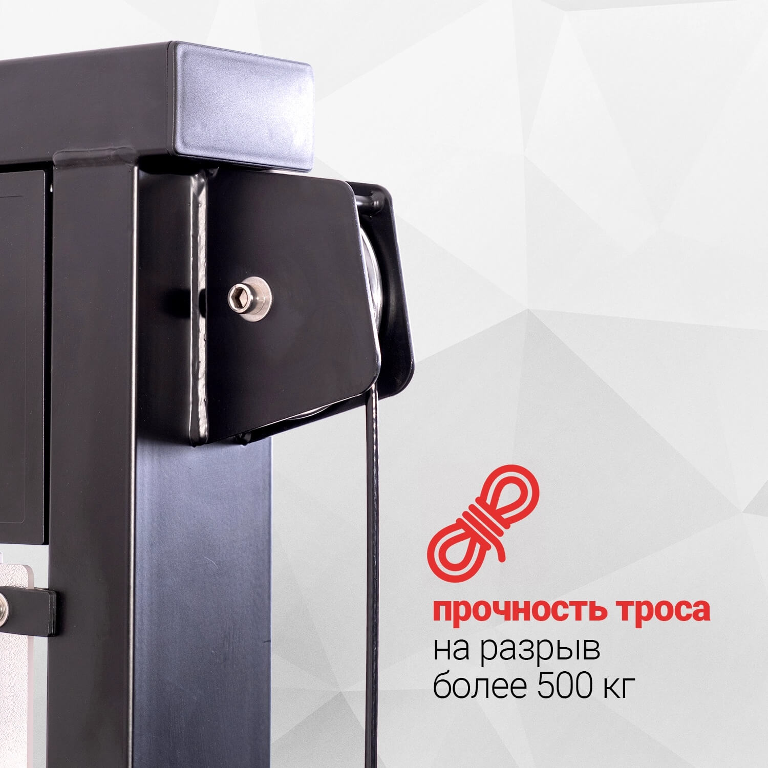 Металлический трос в оплетке, что защищает его от повреждений и увеличивает срок службы. Прочность на разрыв — более 500 кг.