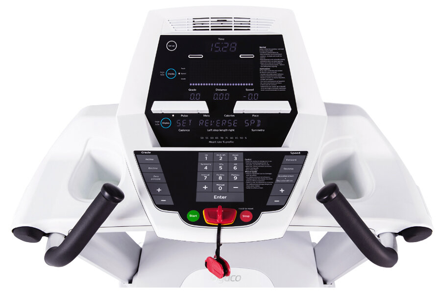 Беговая дорожка оснащена интуитивно понятной светодиодной консолью с четким матричным 20-ти символьным дисплеем и простыми в использовании элементами управления, что повышает удобство использования и позволяет отслеживать результаты. Благодаря предустановленным программам и мониторингу сердечного ритма пользователи могут эффективно достигать своих целей в восстановлении и реабилитации.