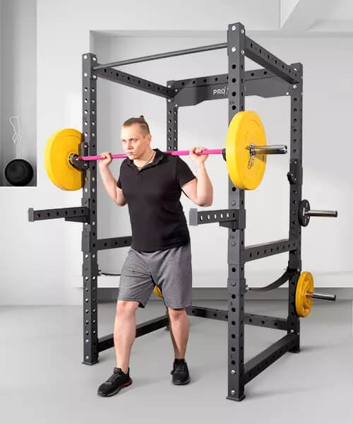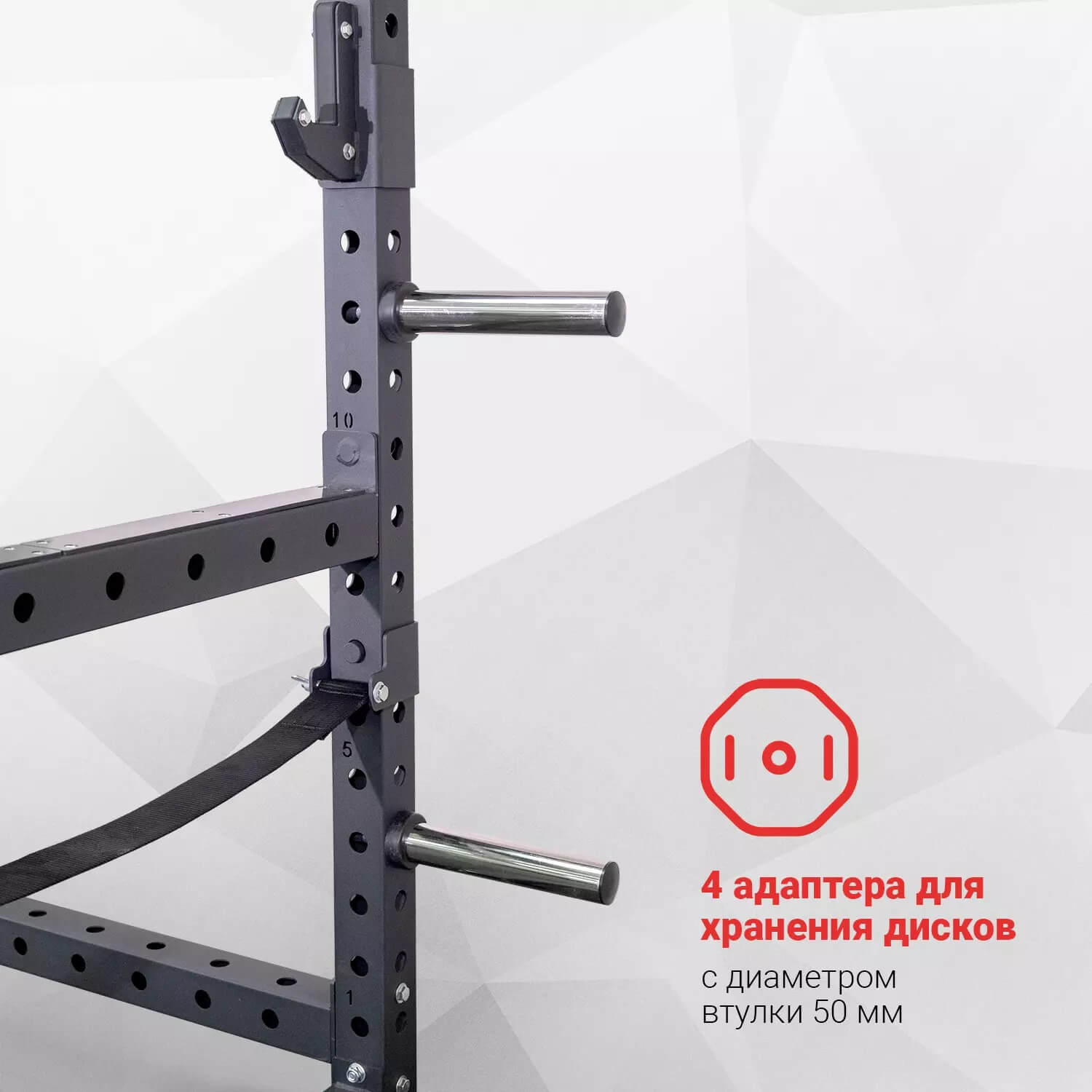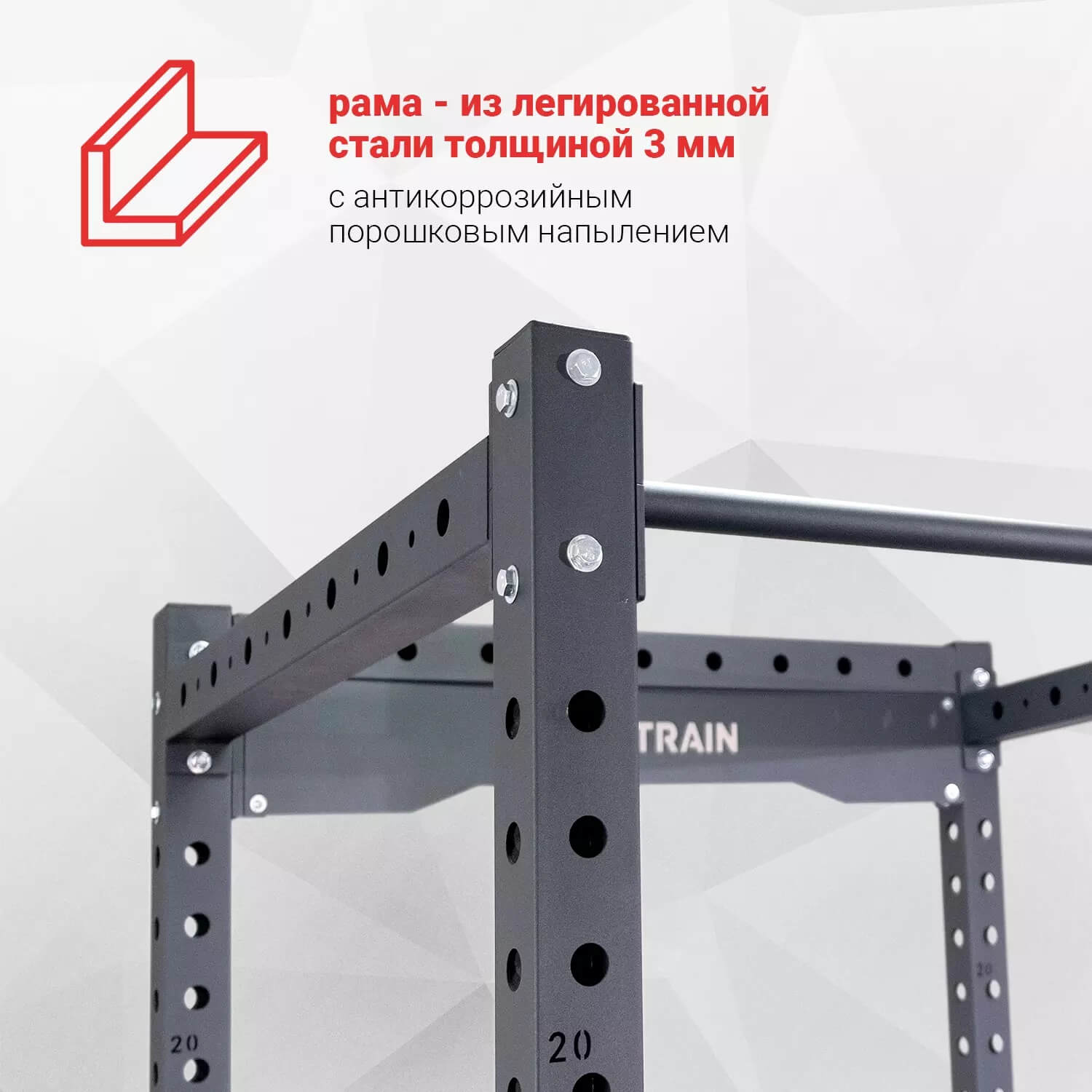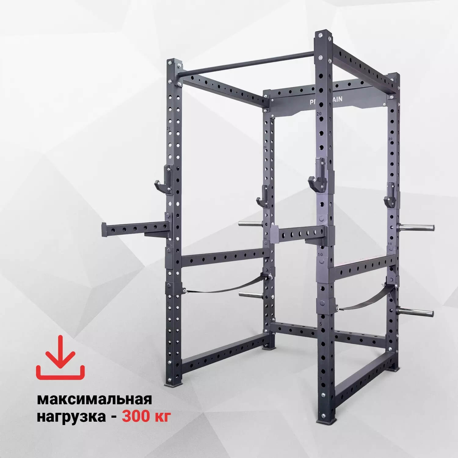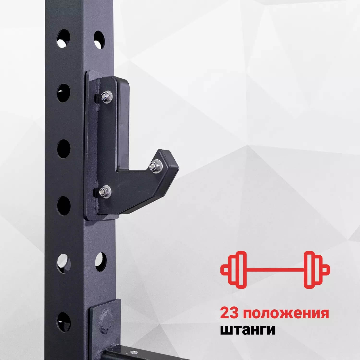 Рама позволяет проработать проработать мышцы ног, спины и груди. Тренажер имеет верхнюю поперечину, которая может использоваться как турник. Для увеличения функциональности можно использовать скамью для жима.