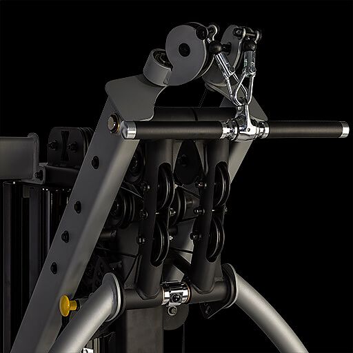 Используйте верхнюю тягу для упражнений на широчайшие мышцы спины с грифом, который идёт в комплекте с тренажёром.