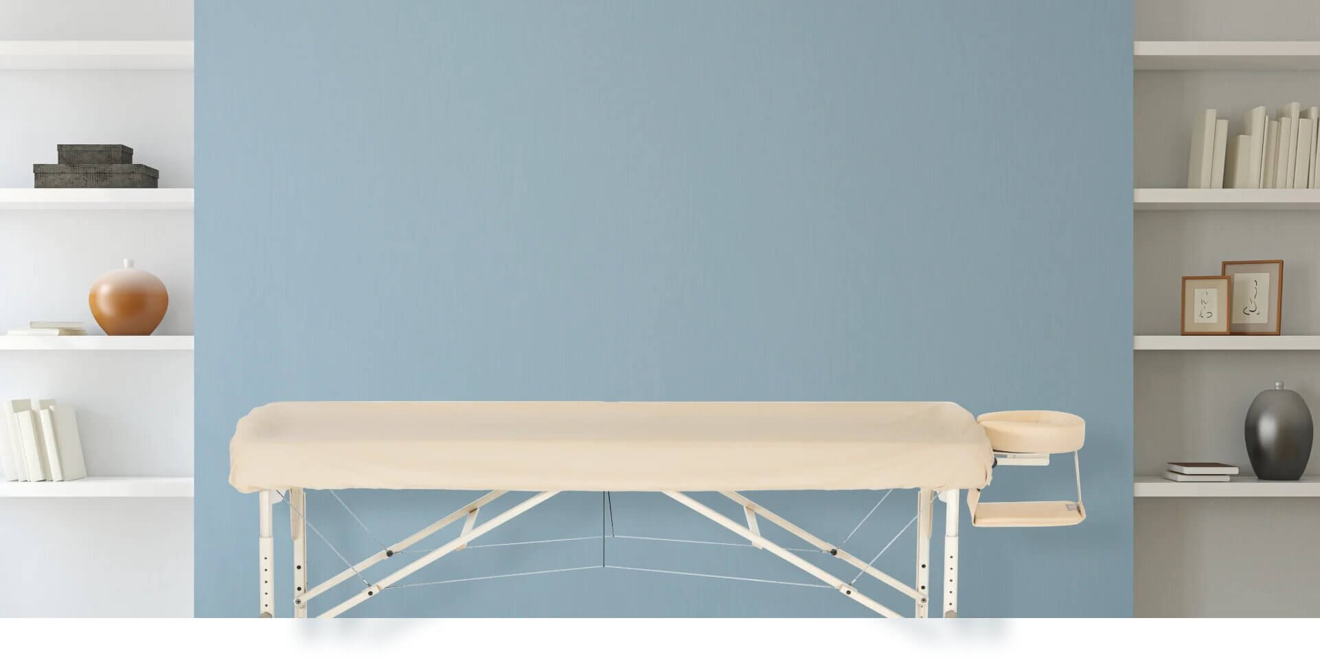 Два чехла-простыни из арпатека SkinTouch в бежевом цвете не теряют свою форму и отлично удерживают масла, не портятся и не пятнятся даже при регулярном использовании; усиленный слинг для рук позволяет снять нагрузку с плечевого сустава и расслабить напряжённые мышцы верхних конечностей у того, кто получает услугу массажа.