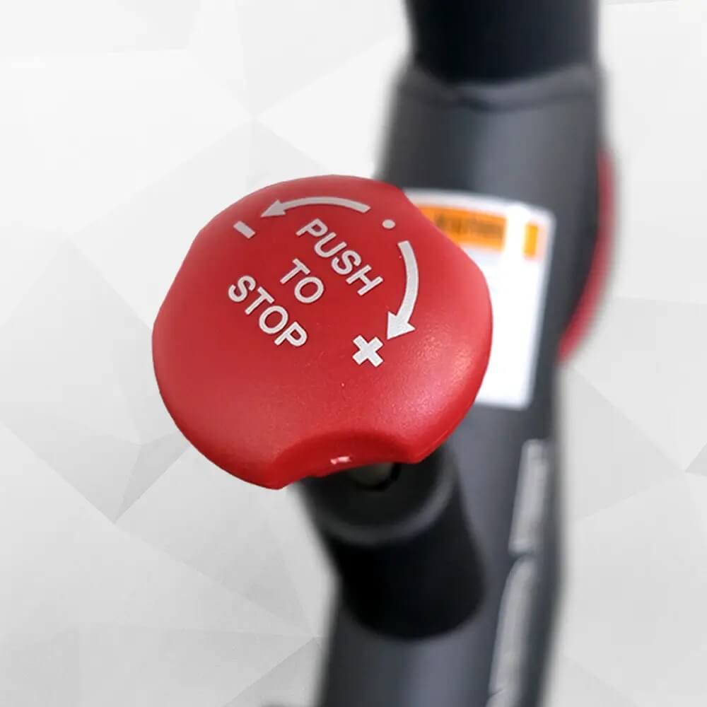 Кнопка аварийной остановки, расположенная под рулем, позволяет быстро и безопасно остановить тренировку даже при интенсивном разгоне, исключая тем самым риск травмирования.
