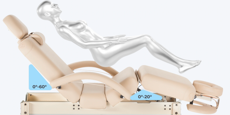 Конструкция стола состоит из трех секций, каждая из которых регулируется отдельно. Все секции стола регулируются под анатомические особенности пациентов с учетом удобства во время проведения определенного вида массажа.