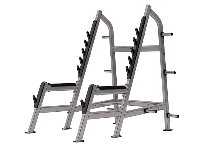 Рама выполнена из овального профиля 50 х 100 мм с толщиной стенки 3 мм. Стальные части тренажеры окрашены методом электростатического нанесения. Двухслойное покрытие устойчиво к сколам и царапинам. Для защиты пола ножки тренажера снабжены резиновыми накладками. Органайзеры для дисков хромированные.
