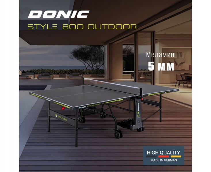 Высококачественный стол для настольного тенниса для использования на открытом воздухе - DONIC OUTDOOR STYLE 800. Данный стол обладает превосходными игровыми качествами и изготовлен из меламина с оптимизированной технологией производства для получения долговечной и надежной поверхности. Толщина покрытия составляет 5 мм антрацитового цвета.