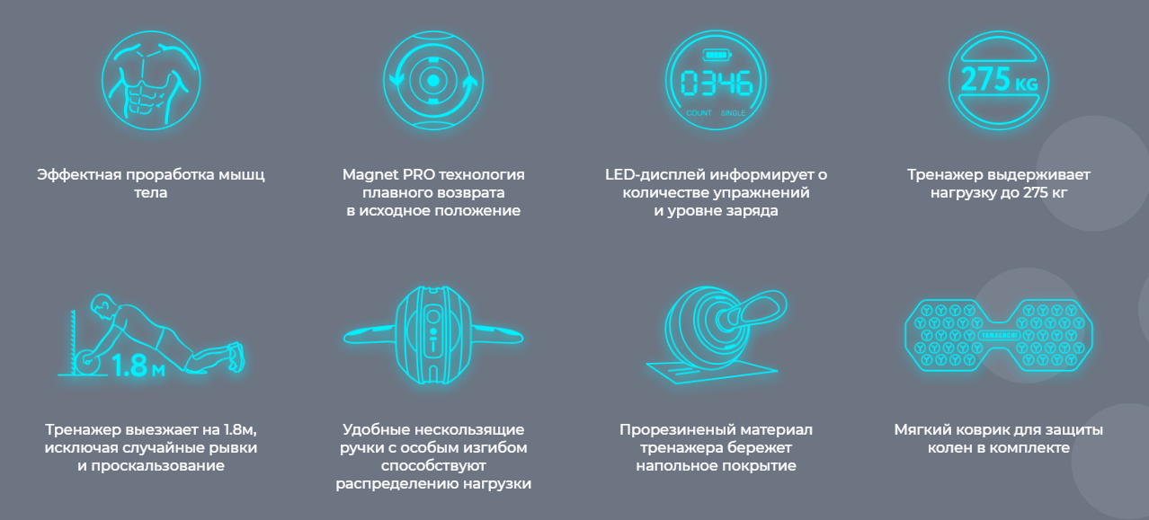 С тренажером легко заниматься, ведь он исключает случайные рывки и проскальзывания ролика благодаря прочному нескользящему прорезиненному материалу, состоящему из нескольких слоев полимеров.