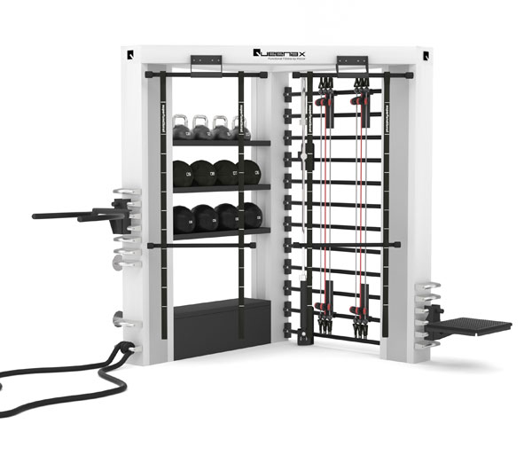 Угловой комплекс на 6 станций Queenax by Precor The Corner. Чтобы включить в работу разные группы мышц пользователь сможет воспользоваться: канатом, стационарными брусьями, плиометрической платформой, олимпийским грифом, 2 комплектами амортизаторов Strong++, 2 комплектами SuperFunctional, парой функциональных лестниц, 3 парами строп (функциональные тренировки), а также борцовской штангой, Для хранения аксессуаров предусмотрены полки.