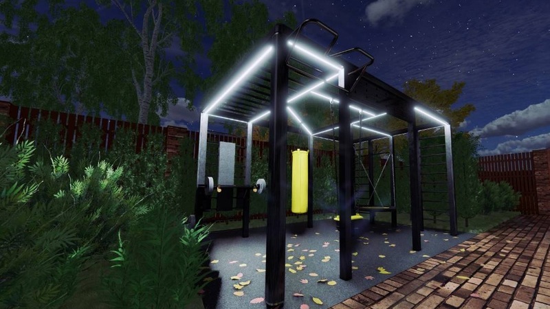 Компактный комплекс размещается на площадке размером 4х4 метра. В каркас интегрирована подсветка (работает при наличии подводки электричества). Основные крепежные элементы конструкции скрыты — так не нарушается гармония общего дизайна и сохраняется необходимая визуальная лаконичность.