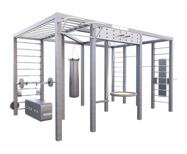 В комплект Desire Open Air входят: три шведские стенки, турник, рукоход, скамья, мешок для бокса, детские качели двух видов, две сетки гамака, пегборд для лазания, съемные брусья, съемный крепеж для штанги, крепление для грифа и дисков. По желанию можно установить ленточные или круглые амортизаторы.