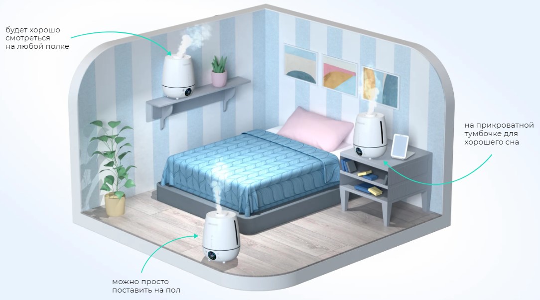 Увлажнитель воздуха дополнительно не даёт коже пересыхать, тем самым обеспечивая ей здоровый, увлажнённый вид.