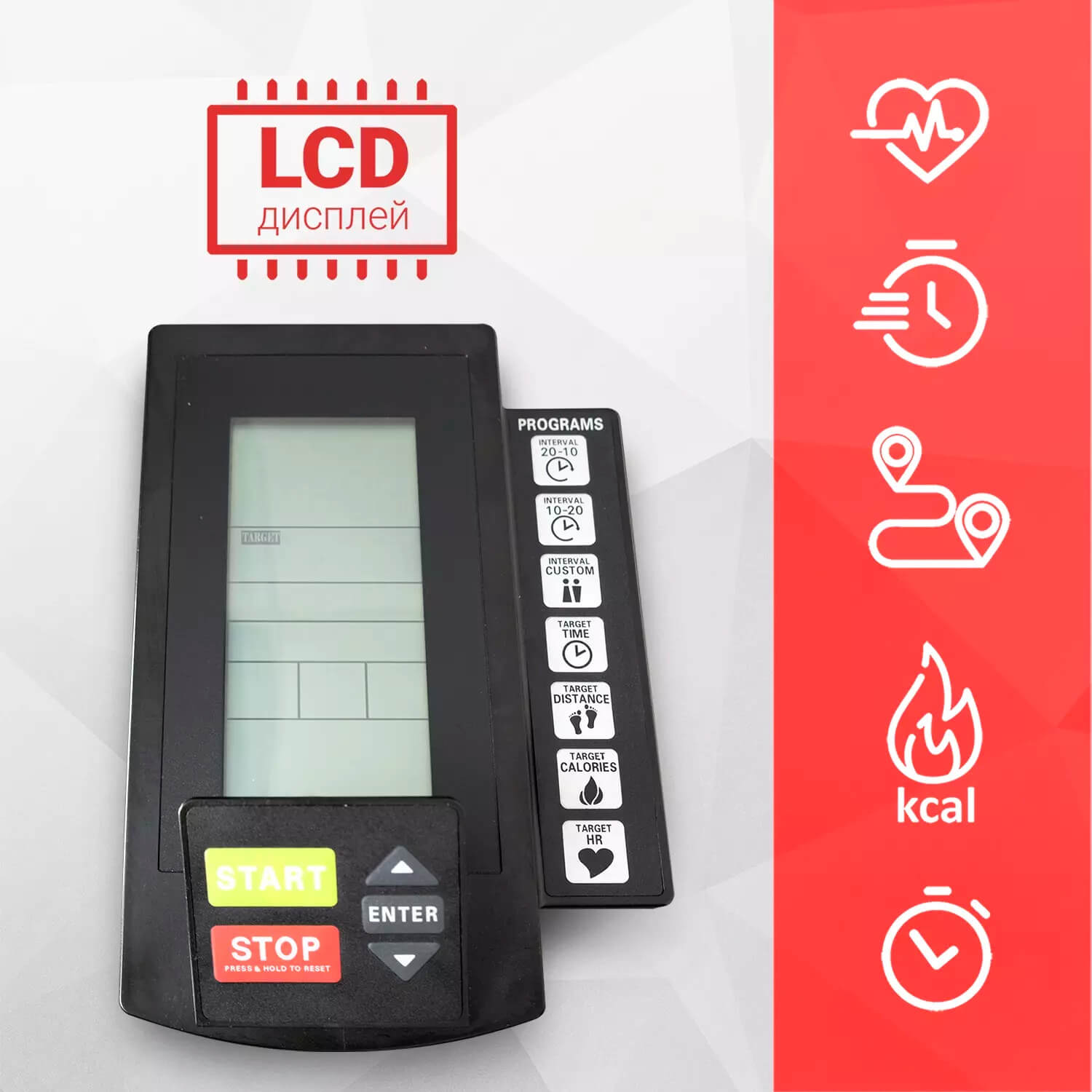 LCD-дисплей отображает значения времени, дистанции, калорий, количества оборотов маховика в минуту, ватт, пульса, скорости. Предустановлено 9 тренировочных программ, HRC (4 интервальные, 5 целевых).