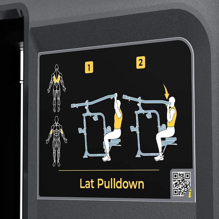 - Инструктивные таблички Обозначения мышц, иллюстрации начала и завершения упражнений, правильные движения на тренажере, QR-код со ссылкой на обучающие видео
