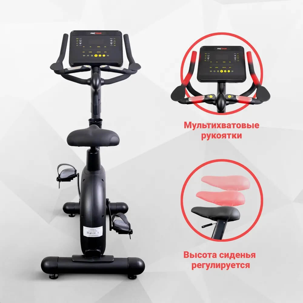 Сиденье регулируется по высоте в 13 положениях. Мультихватовые рукоятки для проработки разных групп мышц. Контактные пластины на руле позволяют измерять частоту сердечно-сосудистых сокращений.