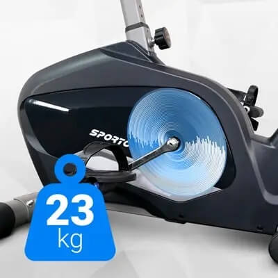 Сбалансированный маховик с инерционным весом 23 кг и сверхновая тормозная система, оснащенная специальными магнитами и прочным ремнем привода, гарантирует бесшумность работы, плавность хода и долгую службу тренажера.
