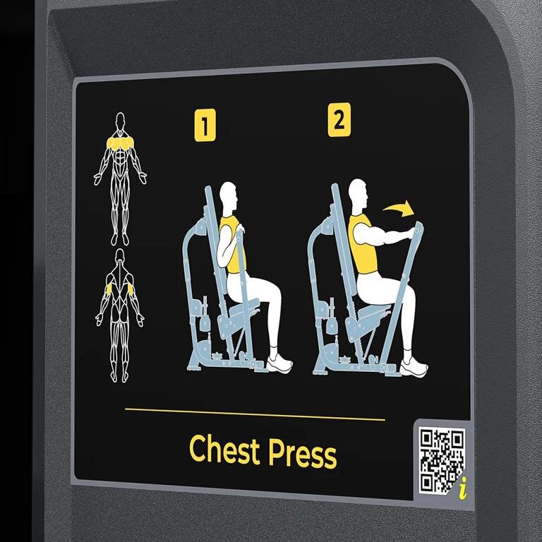 - Инструктивные таблички Обозначения мышц, иллюстрации начала и завершения упражнений, правильные движения на тренажере, QR-код со ссылкой на обучающие видео